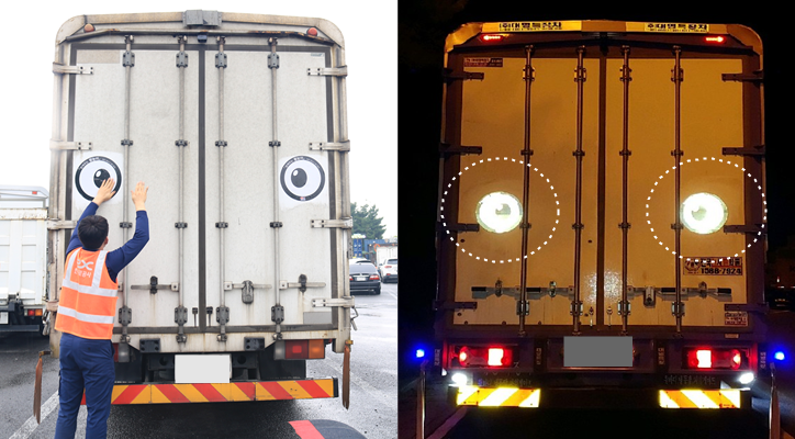‘잠 깨우는 왕눈이’는 눈(目) 모양의 반사지 스티커로, 주간에는 후방차량 운전자의 시선을 자연스럽게 스티커로 유도하고, 야간에는 전조등 빛을 약 200m 후방까지 반사시켜 전방 주시태만·졸음운전을 예방한다.