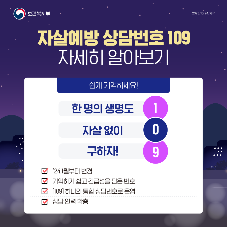 자살예방 상담 접근성을 높이기 위해 1월 1일부터 기억하기 쉬운 3자리 자살예방 상담전화〔109〕를 운영하고 있다고 밝혔다.