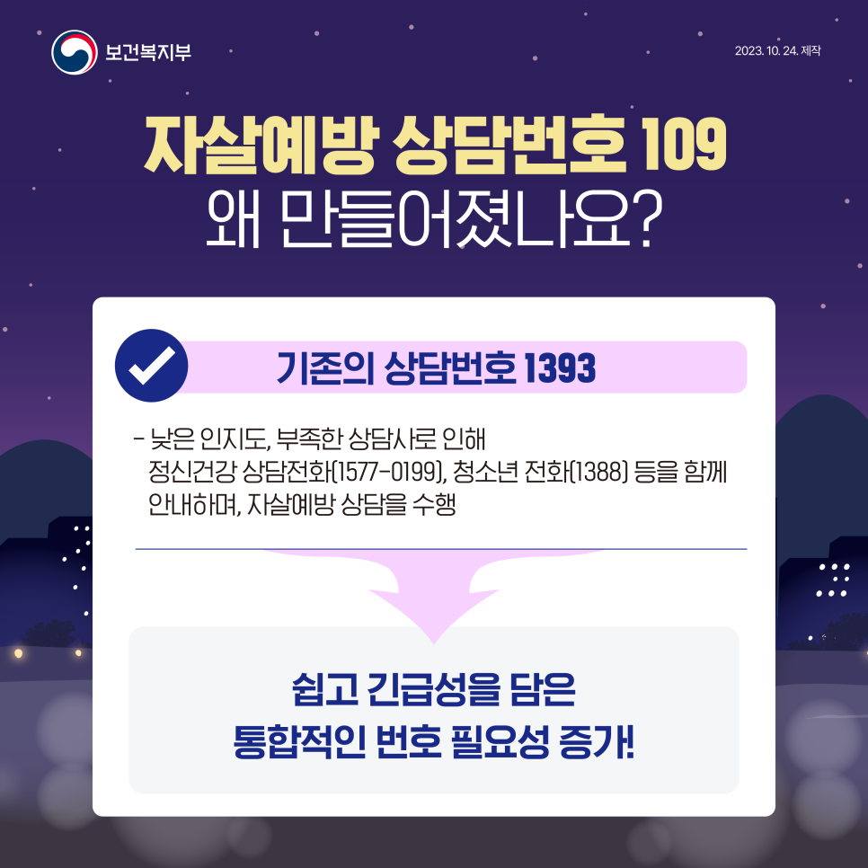 이에 보건복지부는 2023년 2월부터 국민통합위원회 등과 함께 논의하여 힘들 때 바로 생각나고 도움을 받을 수 있는 자살예방 긴급번호를 운영하기로 하였다. 이에 따라 정신건강정책 혁신방안(’23.12.5 발표)의 핵심과제로 추진하며 2024년 1월 1일부터 상담번호〔109〕를 개통하였다.