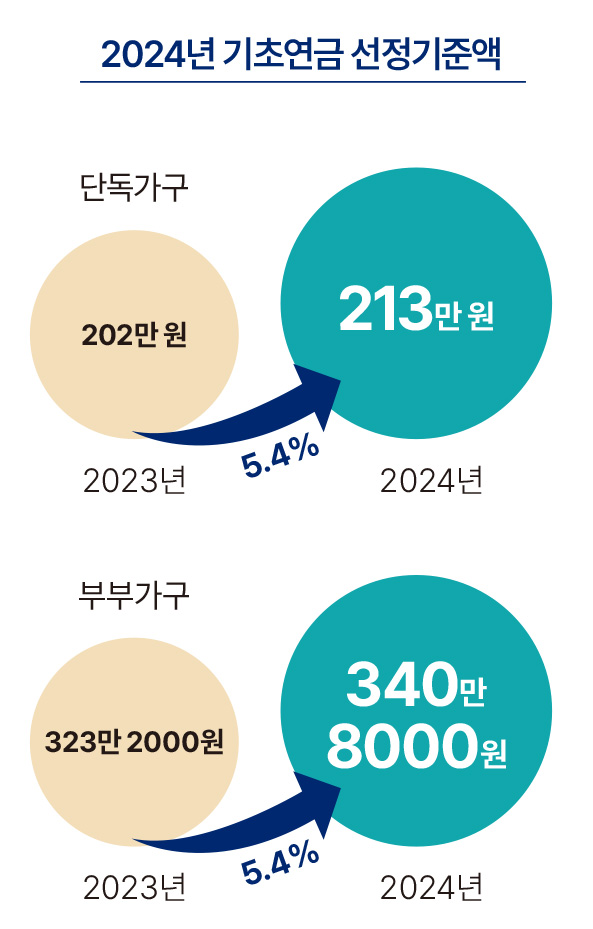 2024년도 기초연금 선정기준액을 단독가구 213만 원, 부부가구 340만 8,000원으로 결정한다고 밝혔다. 노인 가구별 월 소득인정액이 해당 선정기준액 이하이면 기초연금을 받을 수 있다.