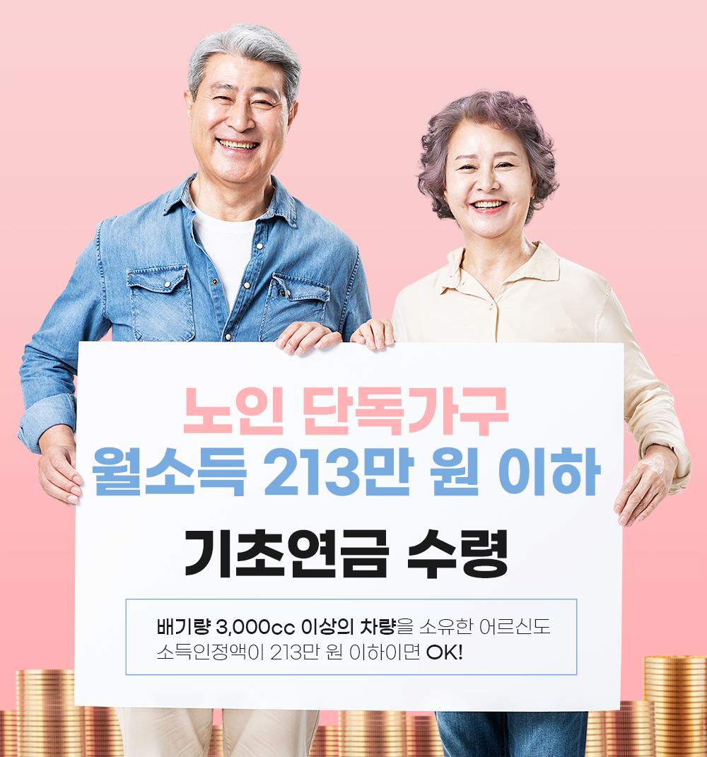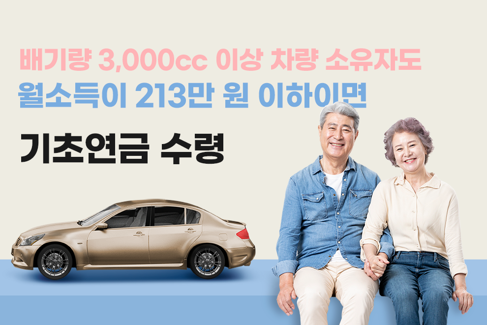 이번 기준 변경에 따라 배기량 3,000cc 이상의 차량을 소유한 어르신도 소득인정액이 213만 원 이하이면 기초연금을 받으실 수 있다.