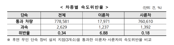 - 후면 무인 단속 장비 설치 지점(3개소)을 통과한 이륜차・사륜차의 속도위반율 비교