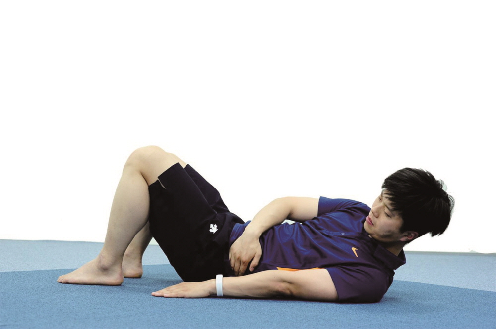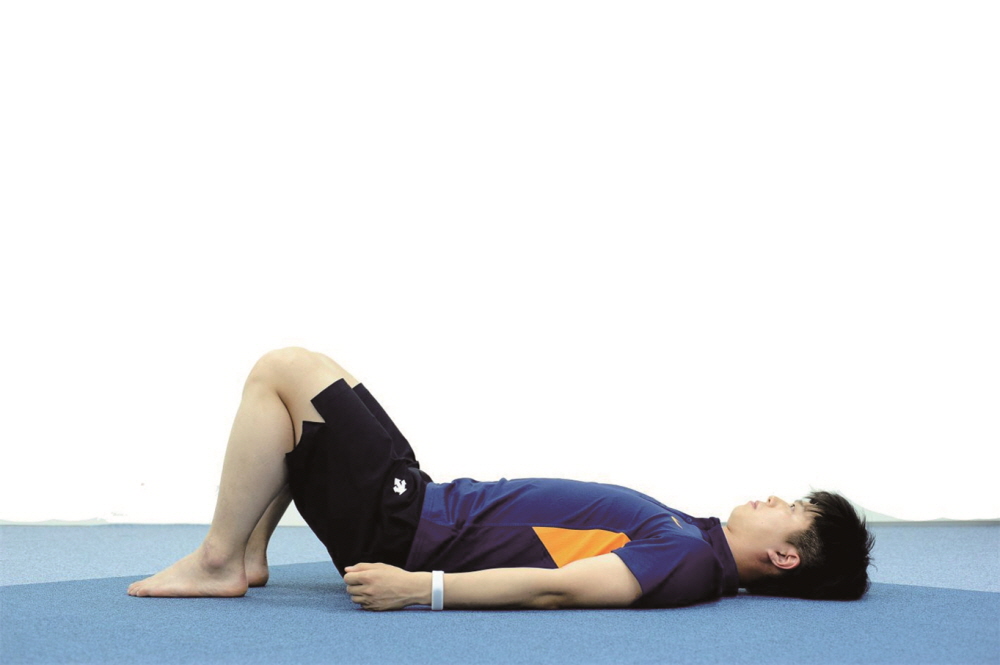 - 편하게 누운 자세에서 양 발을 무릎위치로 가져와 다리를 구부린다.