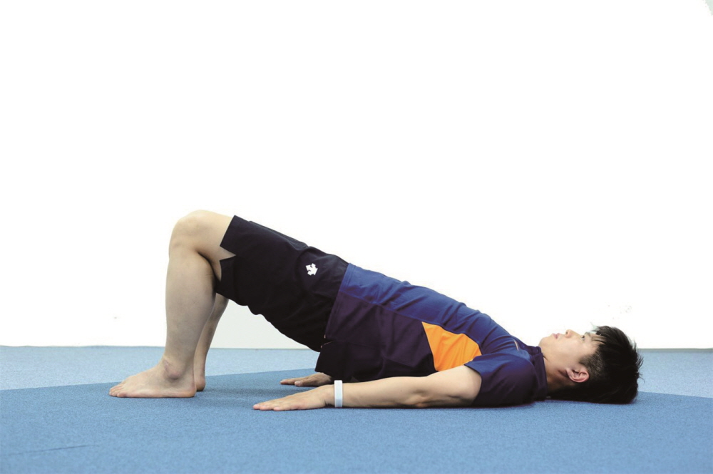 - 항문을 조이는 듯이 아랫배에 힘을 주고 엉덩이를 들어올리고 30초 유지하고 엉덩이를 내린다.