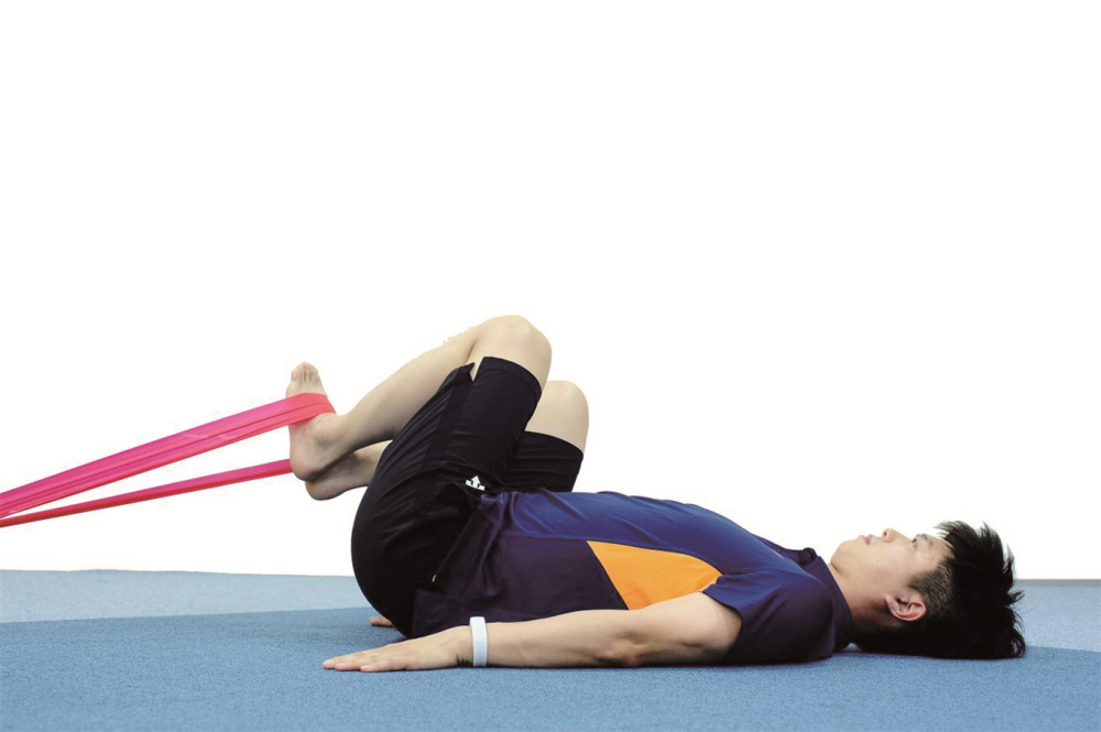 - 항문을 조이는 듯이 아랫배에 힘주기를 유지한 채 몸쪽으로 발목을 올리고 유지한다.