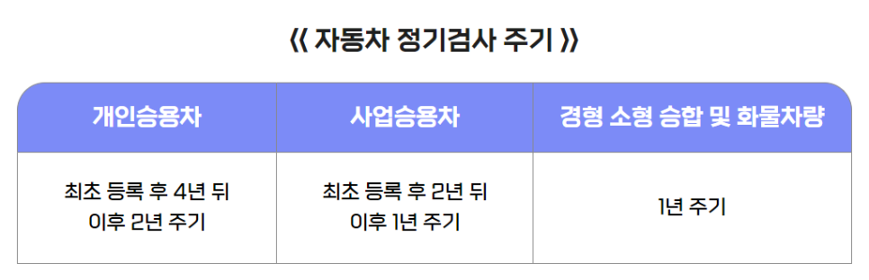 자동차 정기검사 주기는 차량 목적 및 구분에 따라 조금씩 다릅니다. 개인승용차 기준으로 최초 등록 후 4년 뒤에 검사하고 이후 2년 주기로 검사입니다. 사업승용차라면 최초 등록 후 2년 뒤 검사, 이후 1년 주기이고 경형·소형 승합 및 화물차량은 1년마다 검사하고 있습니다.