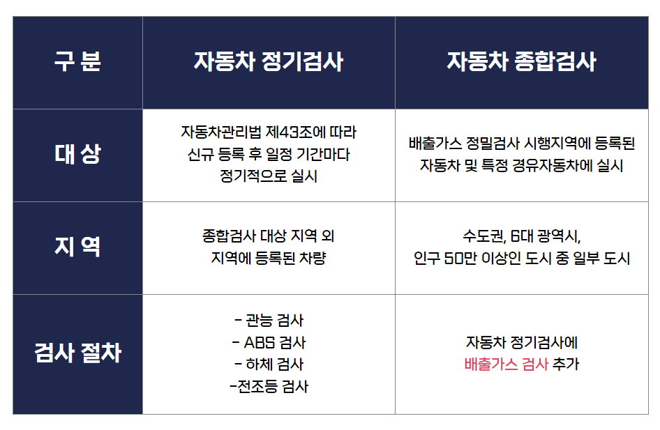 대기환경 규제지역인 수도권, 6대 광역시, 인구 50만 이상인 도시 중 일부 도시에 등록된 차량은 종합검사 대상, 종합검사 대상 지역 외 지역에 등록된 차량이 정기검사 대상입니다.