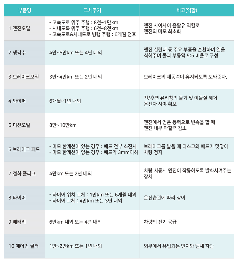 차는 우리의 안전과도 직결되는 문제이다. 그렇기 때문에 차에서 주기적으로 고체해야 하는 소모품들과 부품들의 교체